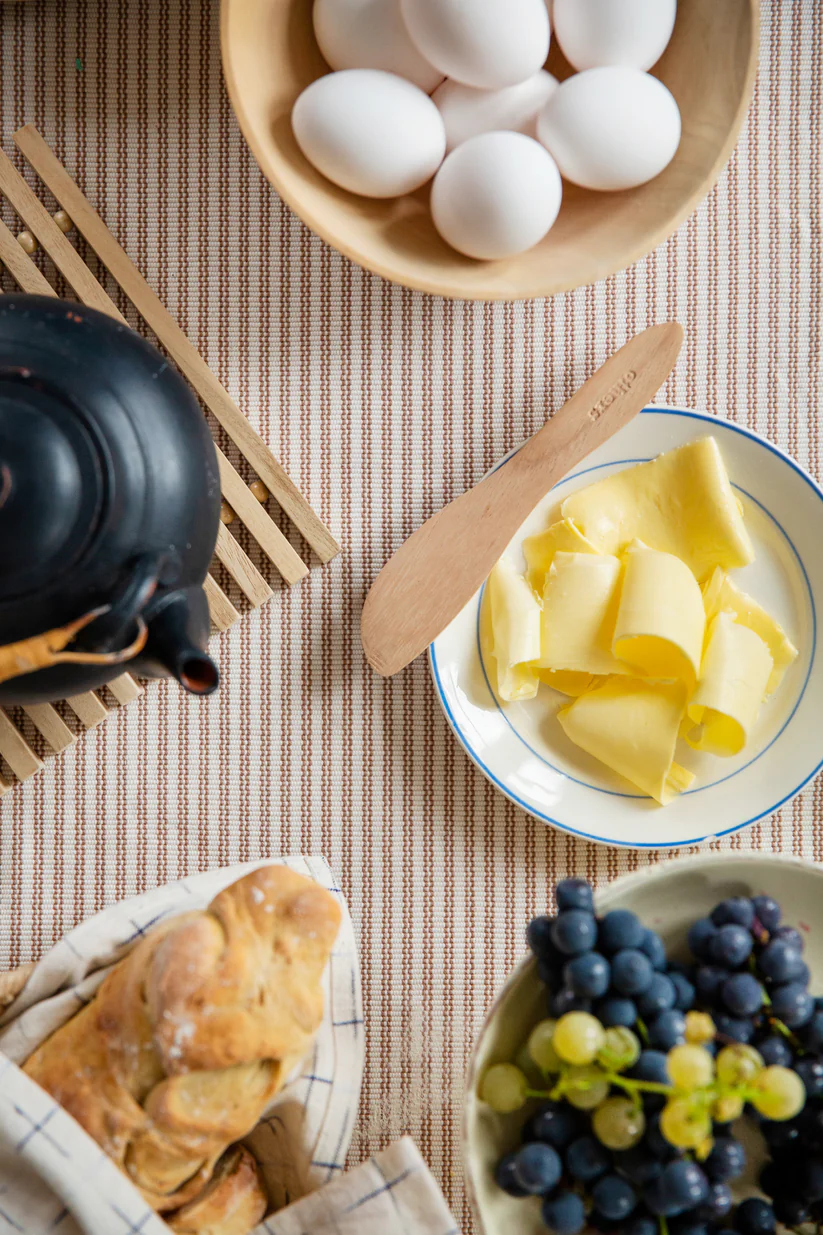 Handcrafted from sustainably sourced Albizia Saman wood—a local wood in Bangladesh known for its beautiful grain and durability—this butter knife is a truly unique piece. Our skilled carpenters in Jashore, Bangladesh, meticulously craft each knife, utilizing smaller pieces of wood that might otherwise go to waste.